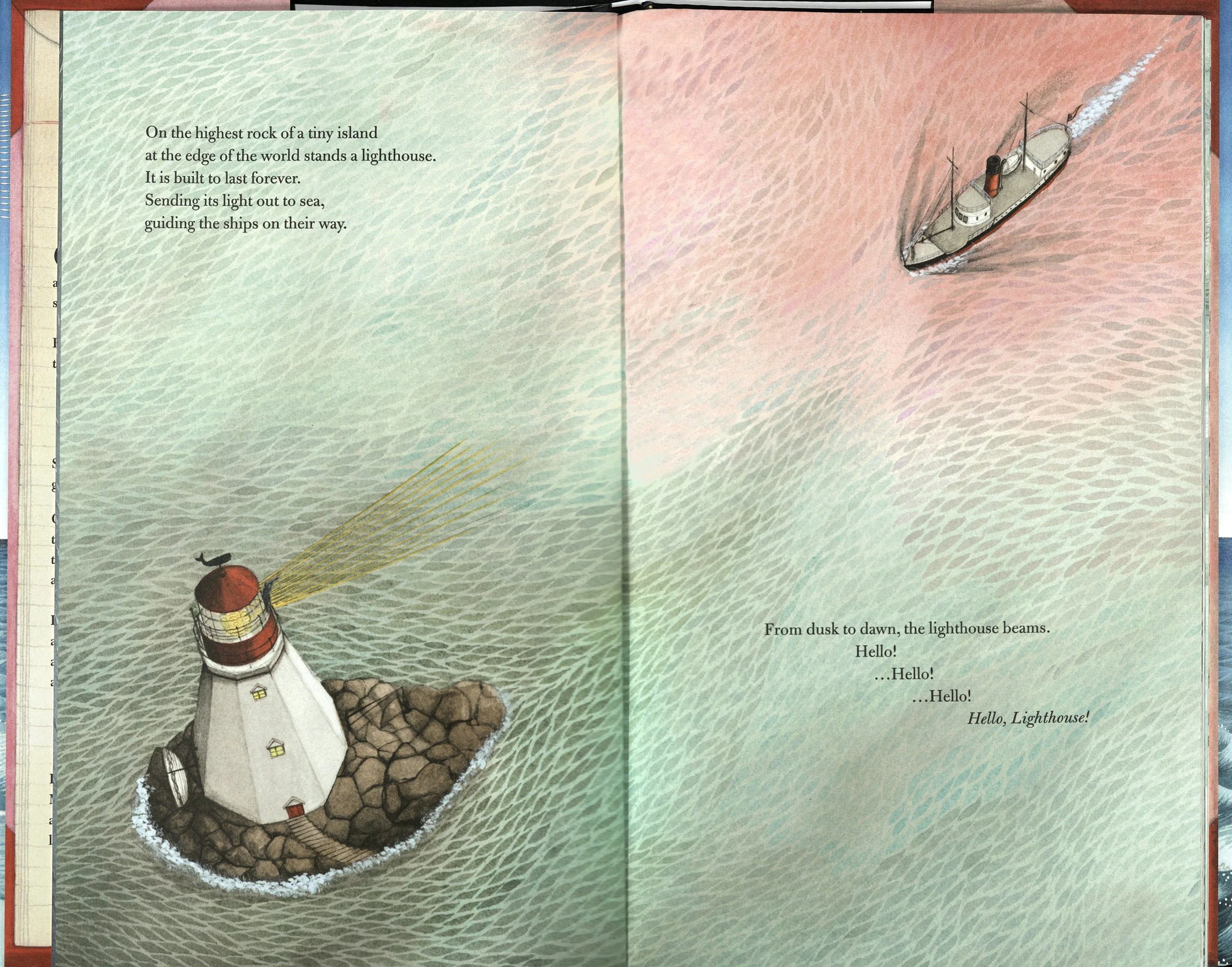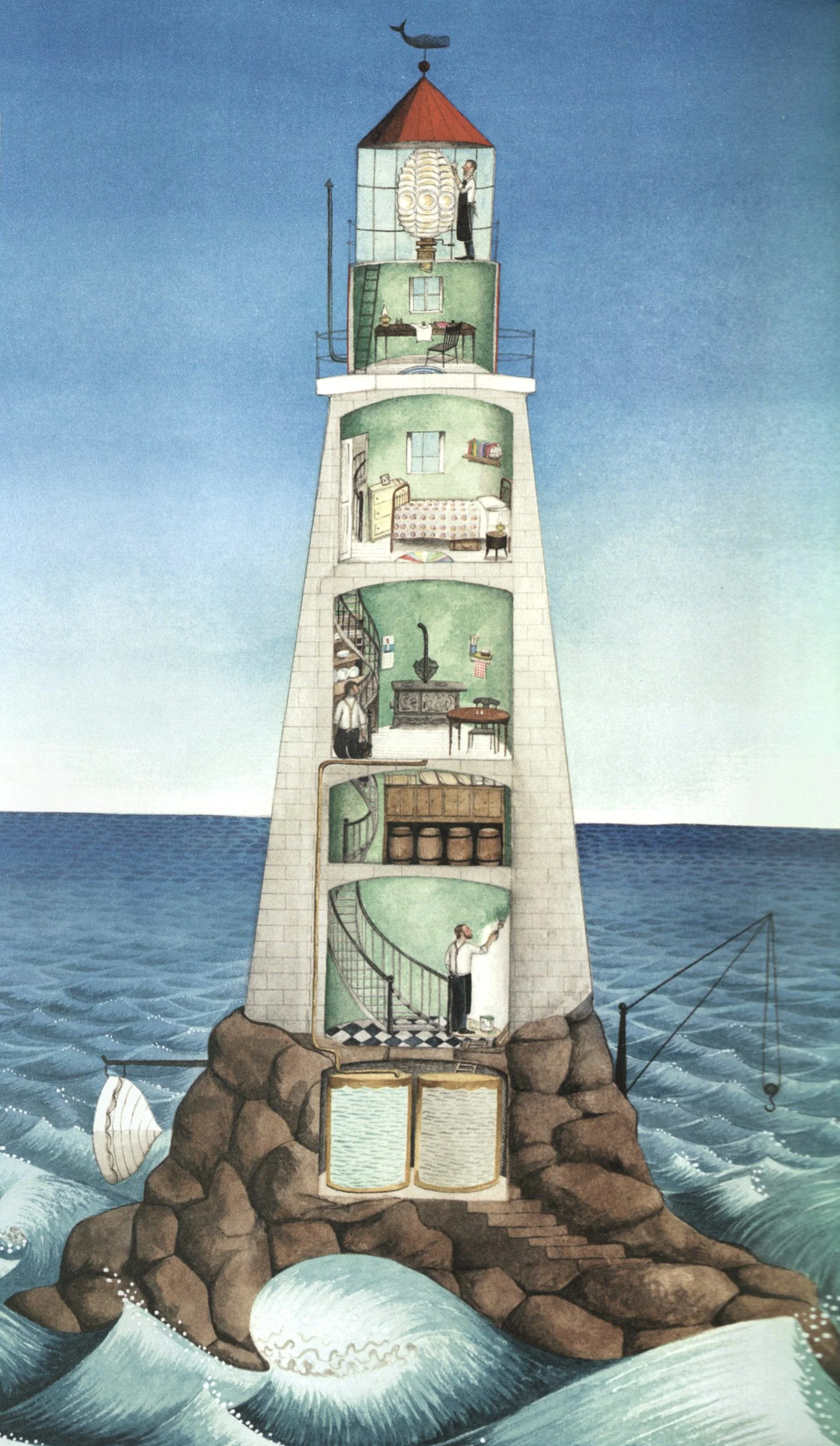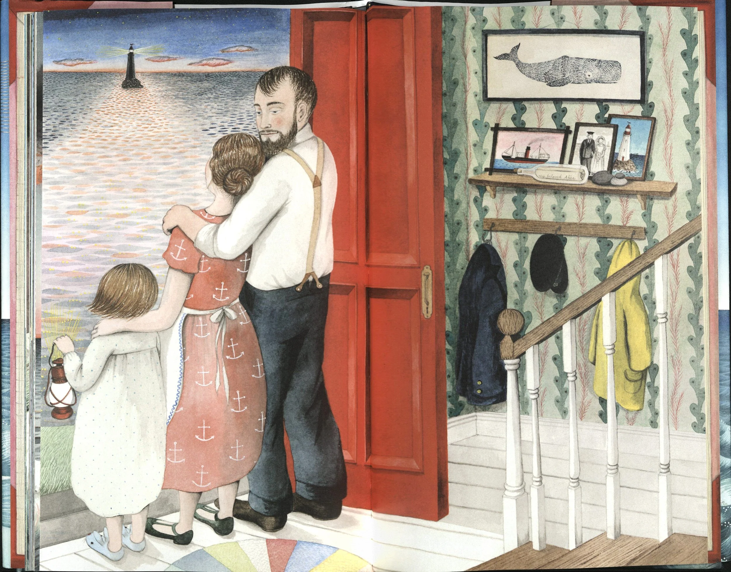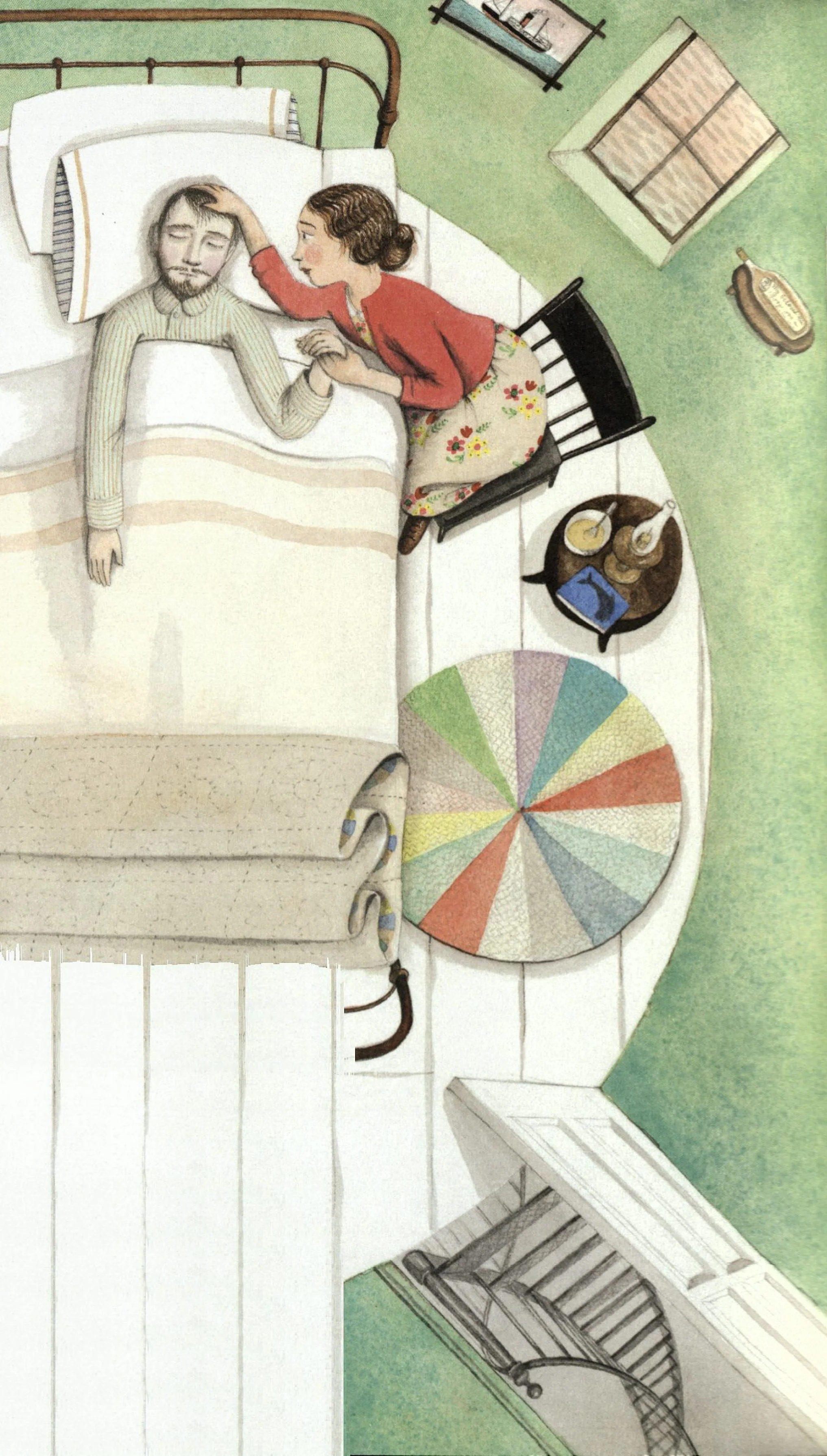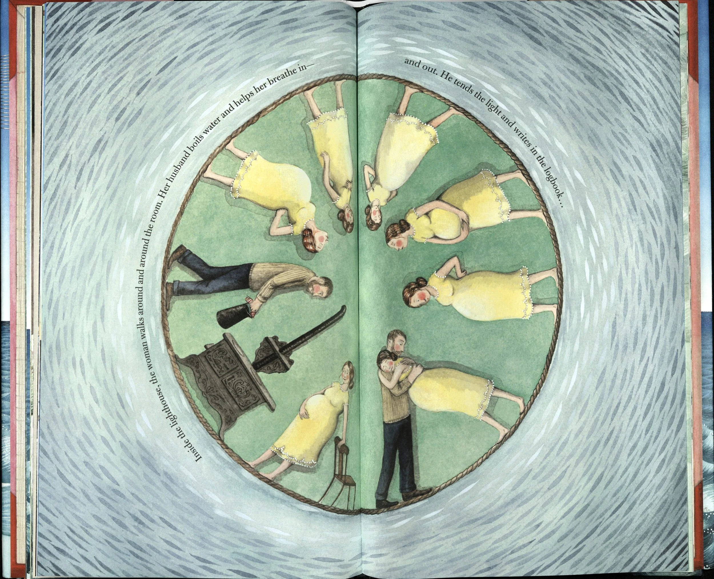 Hello Lighthouse overflows with comings and goings, in a cyclical celebration of life and its meetings and partings. The story opens as the new lighthouse keeper arrives to replace the one before him, scurrying up and down the spiral staircase painting and polishing, as countless other generations of keepers have done before him. A cutaway illustration of the lighthouse showcases his work—a slice of time in not only his life but the long life of this solitary space. Soon more arrivals grace the island, including his wife ferried in by the supply boat and hoisted up with a hook perched precariously on the edge of the tiny island. The difficulty and arduousness with which life arrives, and sustains itself, on this rocky place foreshadows future hardships and departures in the story of the young couple’s life. An event both laborious and celebratory soon arrives when the lighthouse keeper’s wife gives birth to their child. In a circular vignette surrounded by silverly waves of water that bear life-giving nutrients for both the sea and the young couple, the woman paces concentrically as if marking the hours of her labor. And when the baby finally arrives, the doting father cradles her in his arms, his feet resting on the same braided circular rug that marked the hours when he lay ill. In a cycle of loving give and take, he now sits by his wife’s bedside as she rests under the quilt adorned with vibrant variegated rings, just as she kept watch over him a season before. In a final departure that signals not an end but a new beginning, the book ends with the family’s move to the mainland after the coast guard installs a machine-operated lamp. As the family gazes across the bay at their old home from the front porch of their new one, the circular rug lies at their feet, a constant reminder of the revolutions already traversed and those they will tread tomorrow.