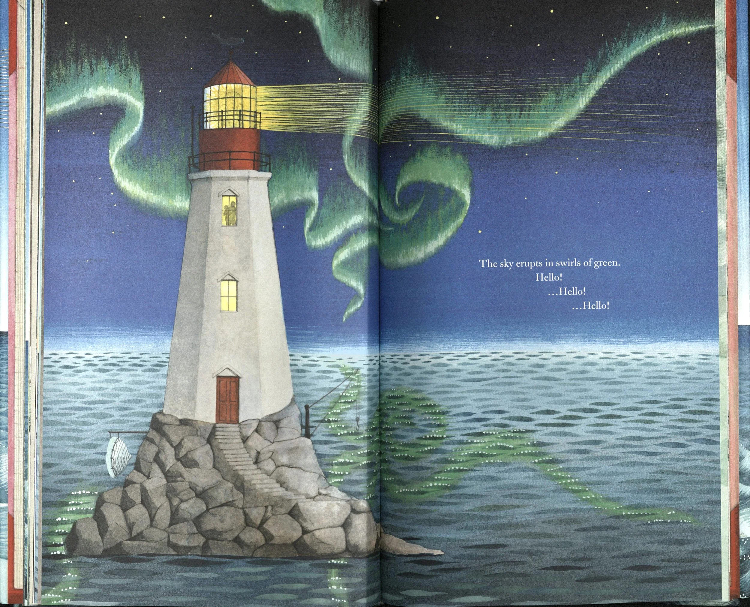 The spinning planet and the cyclical seasons those spins bring provide a constantly shifting backdrop to lighthouse life. While the stoic lighthouse remains constant throughout the pages of Hello Lighthouse, the weather shifts frequently immersing the reader in the atmospheric patterns that delight and plague the lighthouse keeper throughout the year. As the book progresses, the lighthouse is surrounded by whipping spring winds, battered by the crashing waves of a brooding summer storm, shrouded in a thick late season fog, and sealed in a polished shelf of ice. The shifting seasons and surf bring visitors, including speckled seals that slither on the ice, migrating whales that navigate looming ice bergs, and even three sailors shipwrecked on the rocks during a dark and stormy night. When the northern lights flicker into the night sky on a clear cold evening, they scatter shimmering circular pearls of reflections on the sea. When time comes for the family to leave the lighthouse, the weather protests, thickening into a brooding overcast sky. But all somber moods, like somber days, lift and pass on into the past, giving way to jubilant sunsets and sparkling star-filled nights. By book’s end, the lighthouse looks radiant once more, surrounded by delicate clouds wrapped in the fading sun’s orange rays. Just as on dry land, in the lighthouse, the seasons’ change marks a circular march around the sun that promises to repeat forever, just as the lighthouse beam burns brightly in its slow steady spins. But with each revolution, predicable and constant, change is revealed. A child grows from a baby to a little girl who stands as tall as her mother’s waist. A world becomes more modern with electricity that replaces hard labor and sweat. And a family watches a beloved home shift from the tangible present to a corner of their minds. But the lighthouse, the physical embodiment of all that remains constant in this world—love, struggle, memory—stays steady.